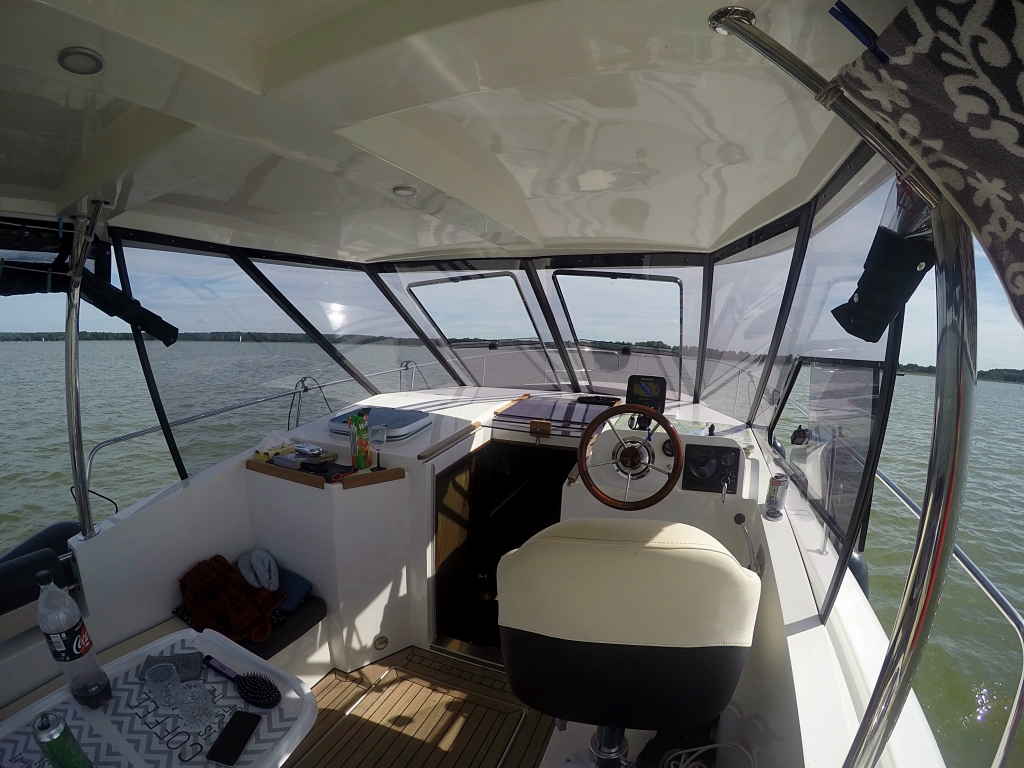 Środek ma w zasadzie bardzo wiele zalet, po za kilkoma wadami. Po pierwsze mnie nie do końca odpowiada dziobowa podwójna kajuta bez możliwości wyjrzenia na świat przez bulaj w burcie. Oczywiście z punktu widzenia designu, umieszczenie w części dziobowej nawet małego okienka, zepsuło by całkiem ładną linię kadłuba. Po drugie twardość materacy na myśl których odnawiają się bule kręgosłupa na przedłużeniu tyłka. Po trzecie zbiornik na fekalia o pojemności niestety nie wystarczającej na całotygodniowy rejs bez zawijania do portu z pompą do ich wypompowania. Na piątkę z plusem zasługuje bardzo szeroki trap z drabinką i prysznicem. Możliwość całkowitego zamknięcia pokładu zasłonami foliowo materiałowymi oraz pokładowy system ogrzewania dający naprawdę super komfort w czasie chłodnej aury. Nie będę się rozpisywał na temat systemu nawigacji, sonaru, pozycji za kierownicą, systemu audio lub lodówki. Wszystko działało bez jakichkolwiek problemów szybko tanio i sprawnie. Dostatek wyposażenia dał nam możliwość przygotowywania śniadanek, obiadków i kolacyjek, na środku jeziora lub stojąc na kotwicy w zacisznej zatoczce.